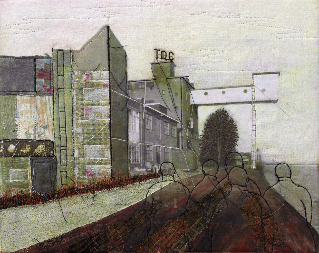 Dit werk is gemaakt voor de "Prentenatlas Nijkerk" . Mixed media o.a. Verf, machinaal borduurwerk, applicatie, transfer. Voor meer informatie over dit boek zie informatiepagina Prentenatlas.