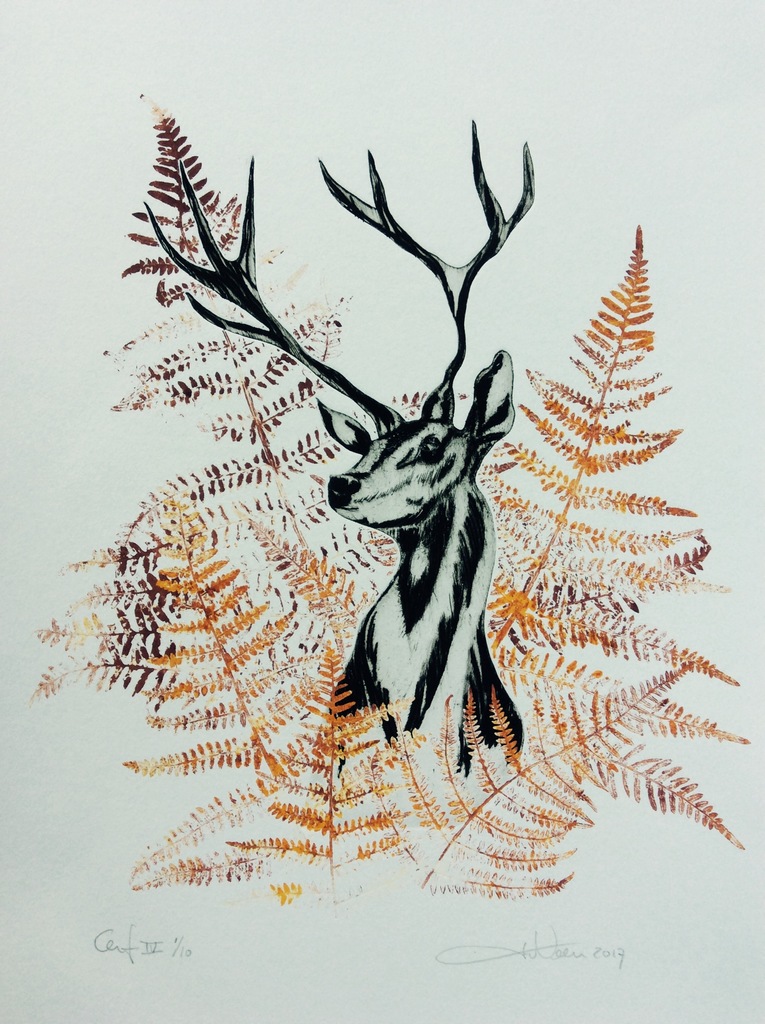 Hert 4 / Cerf 4 - droge naald - uigezaagd zinkplaatje - monotype - meerkleuren druk - oplage 1/10