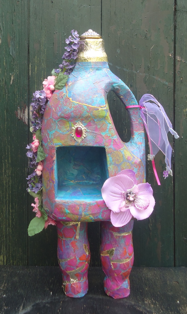 Dit "huisje" of kleine etalage is gemaakt van een wasmiddelfles en papier-maché. Het is bedoeld om iets in te leggen dat je dierbaar is. B.v. een sieraad of een foto.