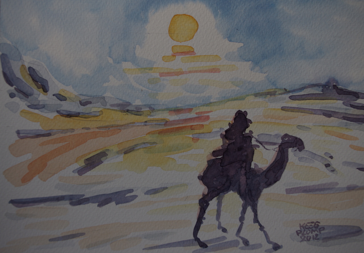 waterverfschets tijdens een kamelentocht door de woestijn