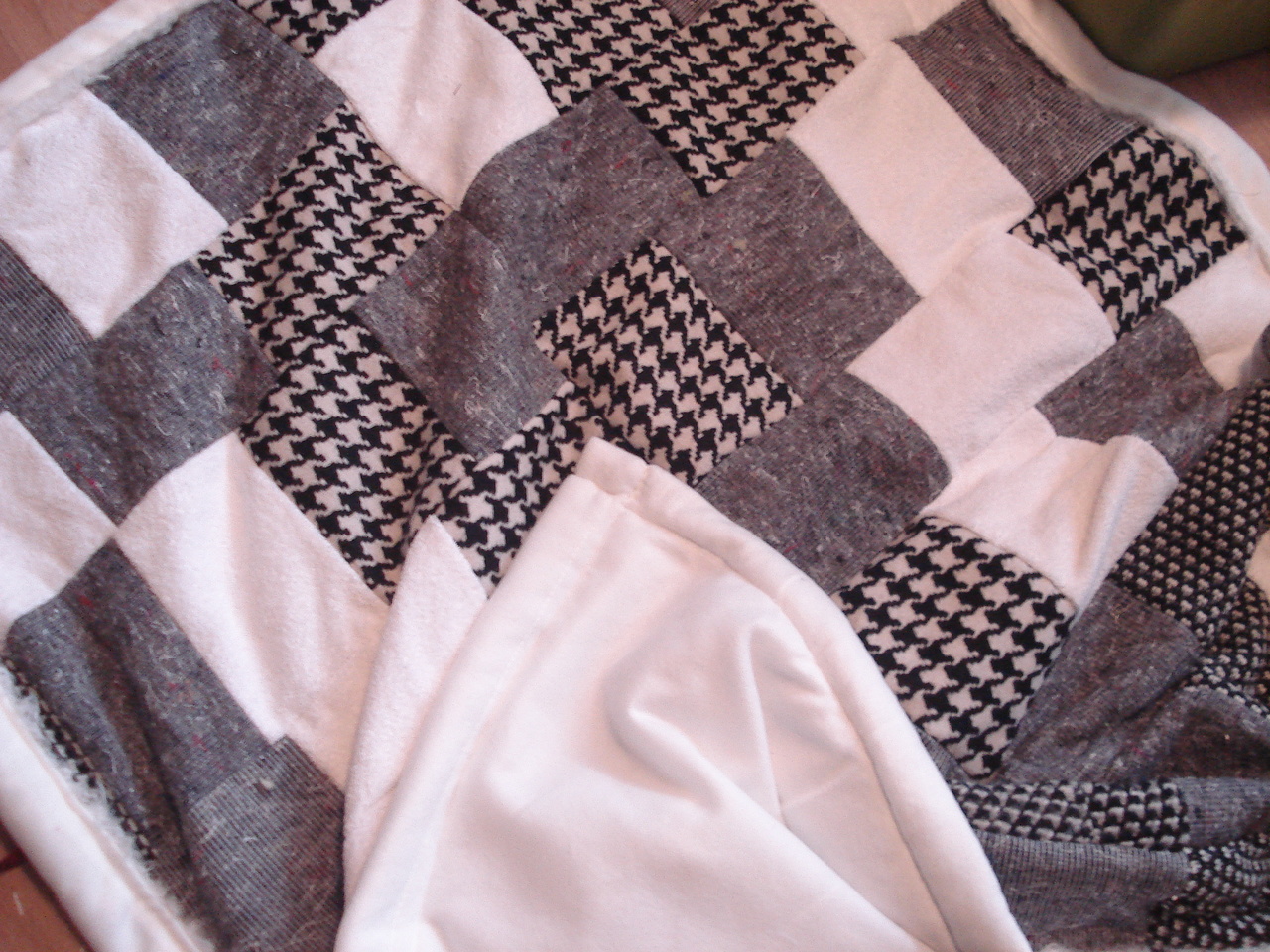 Stukken grijze en witte stof, waaronder een verhuisdeken. Puur hergebruik. Gevoerd met een zachte witte stof.