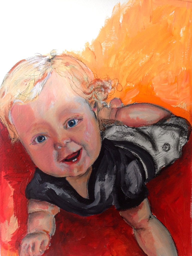 Oranje Geel Kind Portret Acrylverf Houtskool