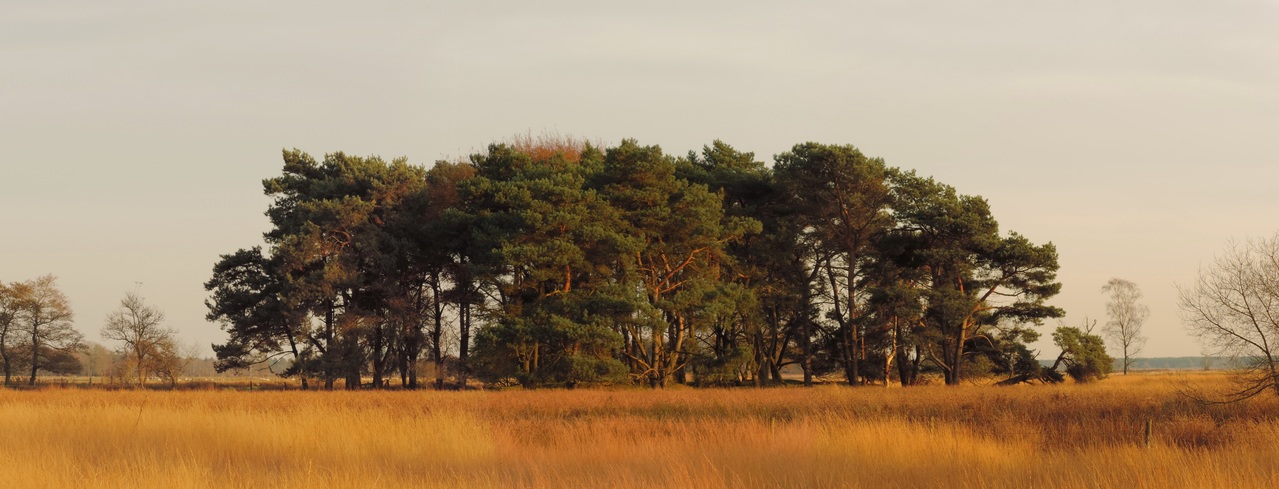 Een groep van grove dennen wordt door het winterzonnetje prachtig verlicht.