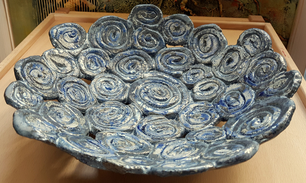 keramiek schaal ;"geschuurd"blauw fruitschaal, decoratieschaal