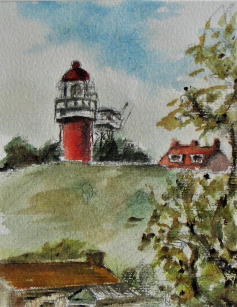 Vuurtoren vanuit het dorp van Vlieland, verkocht. Ingelijst in passe-partout 50 x 50