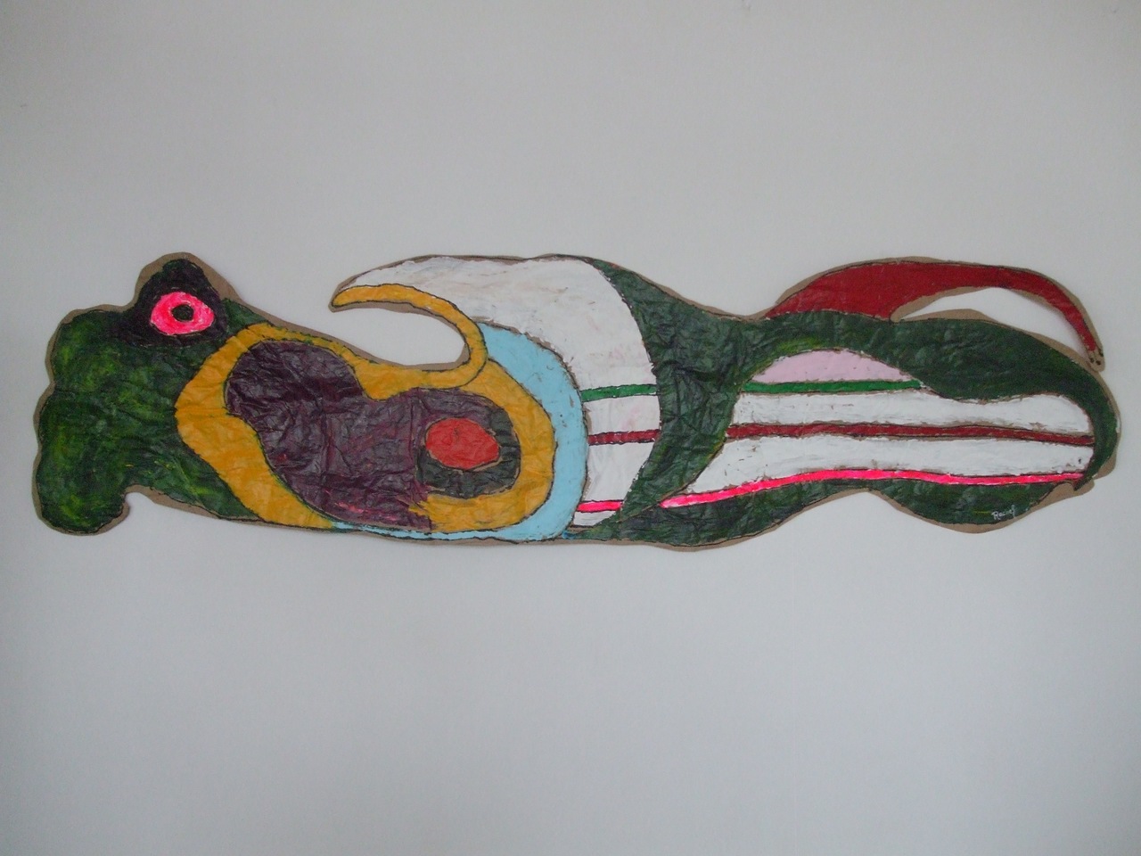 Vis met acrylverf / collagetechnieken op bewerkt pakpapier. De vis is bedoeld om in de ruimte te hangen. Hij is aan beide zijden te bezichtigen. Deze vis is de andere kant van vis 4
