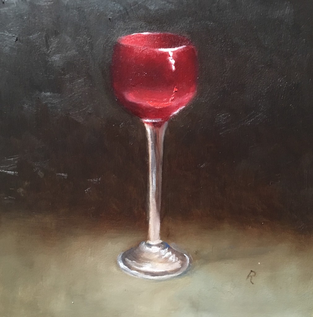 wijnglas *Dit schilderij is met olieverf en penseel opgebracht. *Ingelijst. * Vernislaag is aangebracht mat/glans. *Houtenpaneel. *Het schilderij is gesigneerd op de achterkant met de eerste letters van mijn voor en achternaam (RP) Renate Peters en met de datum dat het schilderij is gecreëerd. Aan de voorkant is er de letter R (van Renate) te vinden rechts onderin.