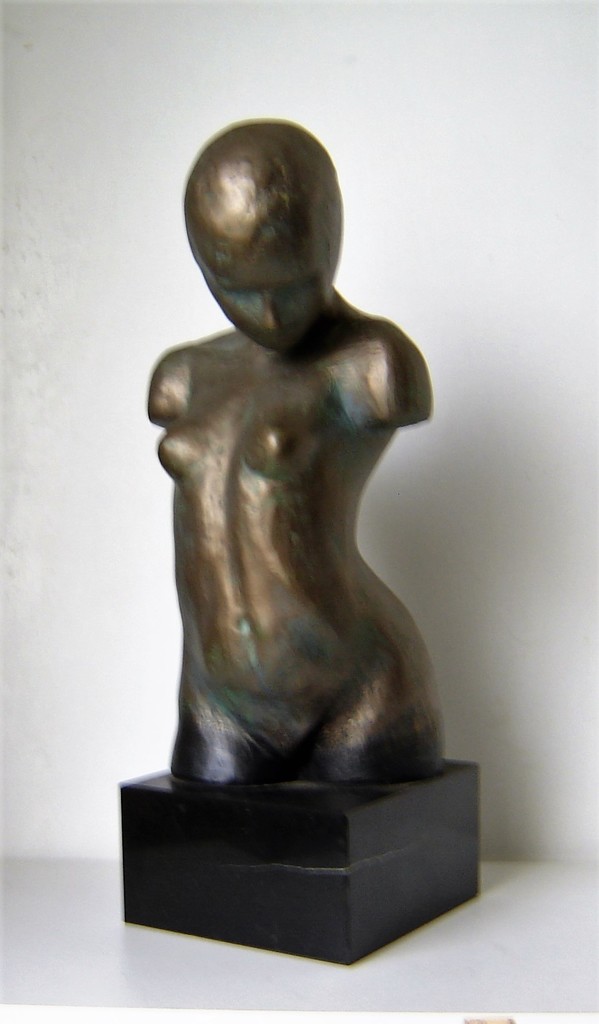 Keramiek + acrylverftechniek bronskleur. Verlijmd op natuurstenen sokkel.