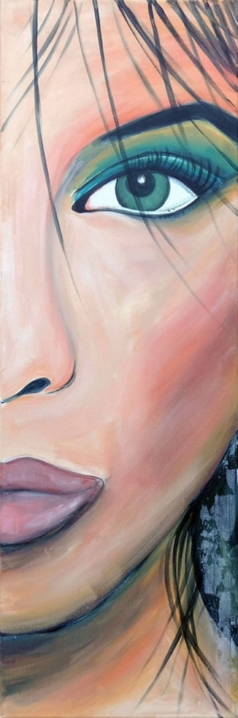 Modern rechthoekig schilderij van een Italiaanse vrouw. Deze kleurrijke halve close up heb ik geschilderd met acrylverf.