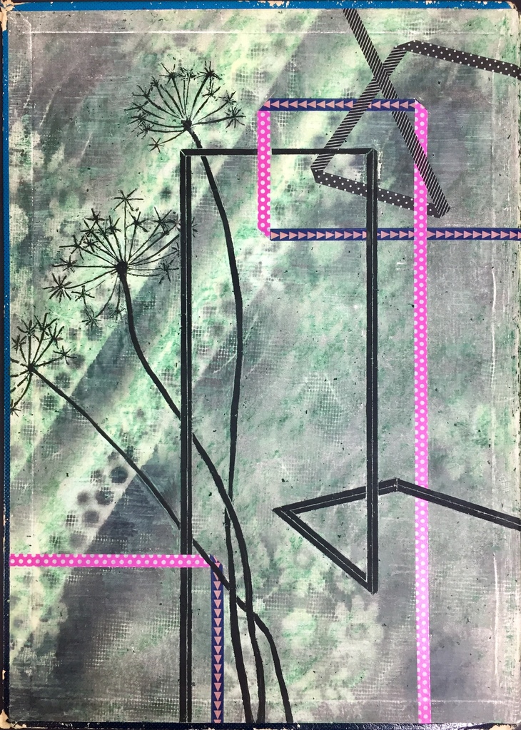 BOEKOMSLAG, oliepastel, spuitverf, botanisch, geometrie,