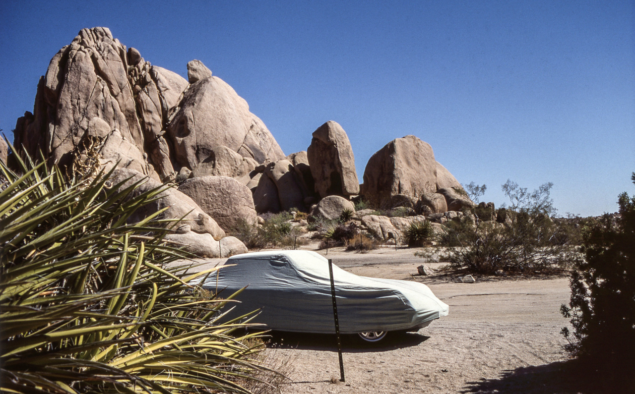 In de Mohave Desert houdt de weg plotseling op. Er is een keerlus. En daar parkeer je je auto als je een wandeltocht van een paar dagen gaat maken. Beschermd tegen de felle zon. Gesigneerd, geprint op A3+
