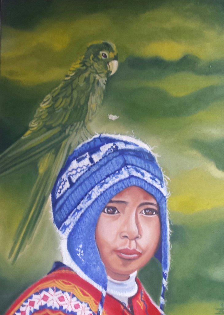 Kind met papegaai / Bolivia, inclusief houten baklijst