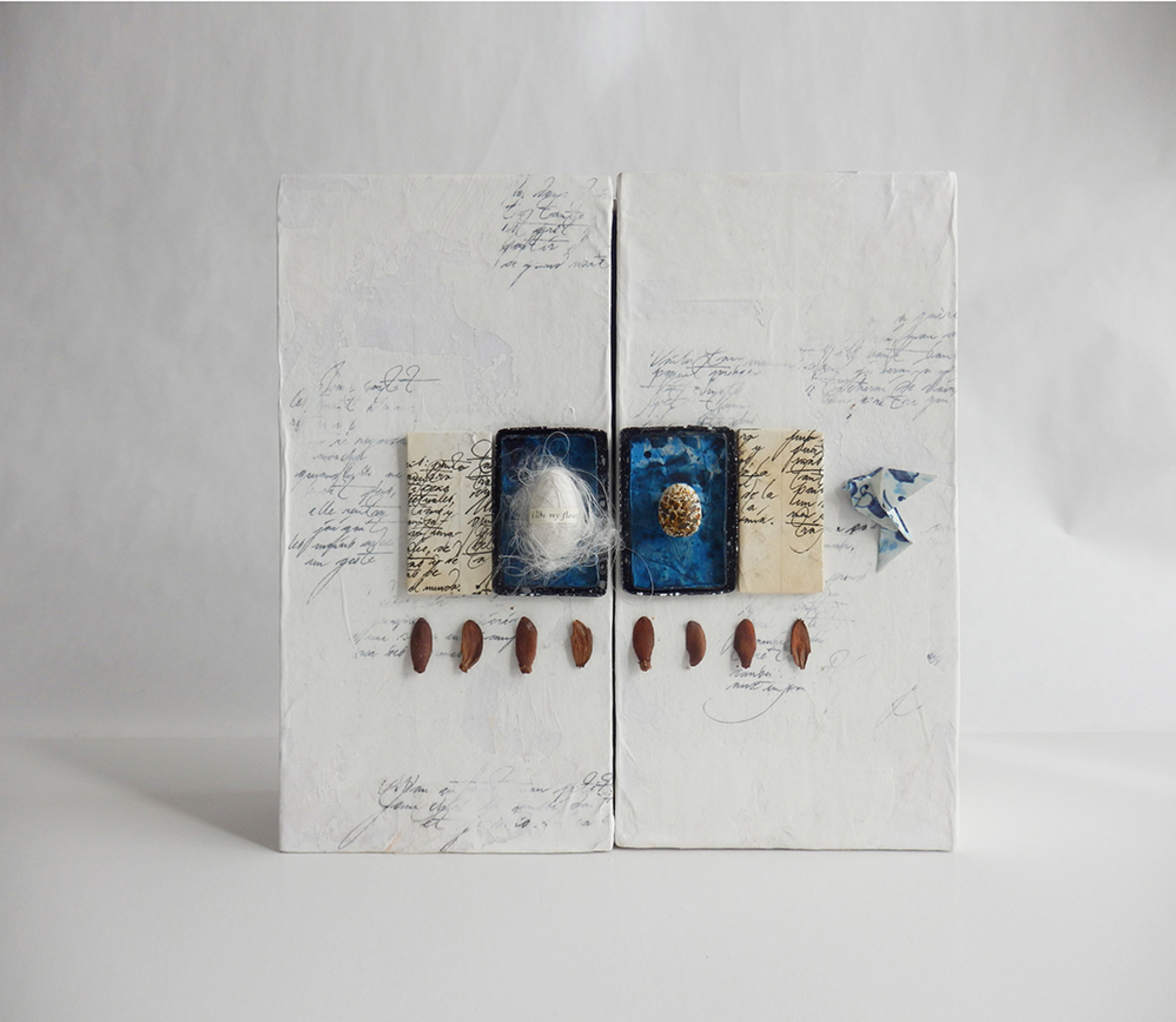 Condoleanceboek Le revoir heeft een doosomslag met een witte ondergrond met flarden geschreven Franse teksten. Gecentreerd op het omslag zijn twee ondiepe bakjes te zien met in het linker bakje een cocon met zijdedraad eromheen een een reepje tekst uit een oude roman. In het rechterbakje ligt een zwart/licht bruin gespikkeld ei. Aan weerszijden naast de bakjes zijn plakjes beschreven Franse tekst op oud papier. Uiterst rechts is ook een origami duif te zien, gevouwen uit blauw gedessineerd papier. In een rechte horizontale lijn daaronder zijn hout-achtige blaadjes te zien, deze zijn afkomstig van een conifeer. Het boek wat in de doos ligt heeft 100 pagina's, alle bladzijdes zijn te beschrijven. Het is jammer dat er maar 1 foto te zien is want de doos heeft een hele sfeervolle binnenbekleding en er ligt een uniek, handgemaakt boek in waarvan de pagina's op een speciale manier bewerkt zijn. Als je geïnteresseerd bent, laat een berichtje achter en ik stuur je meer beeldmateriaal toe van dit boek!