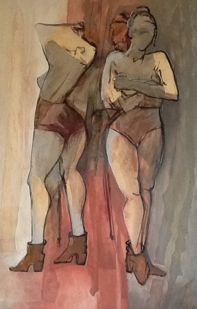 Combinatie van stukken papier en schilderwerk in acryl op een doek, 3 vrouwen in ondergoed.
