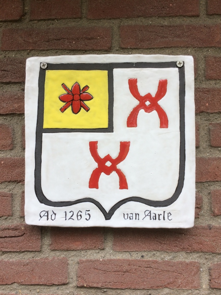 Dit is het familiewapen van de familie Van Aarle op een keramische tegel.