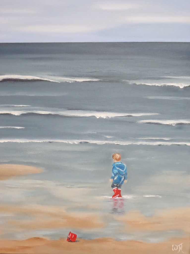 40 Strandtafereeltje van een klein jongetje in de grote zee geschilderd aan de hand van een foto