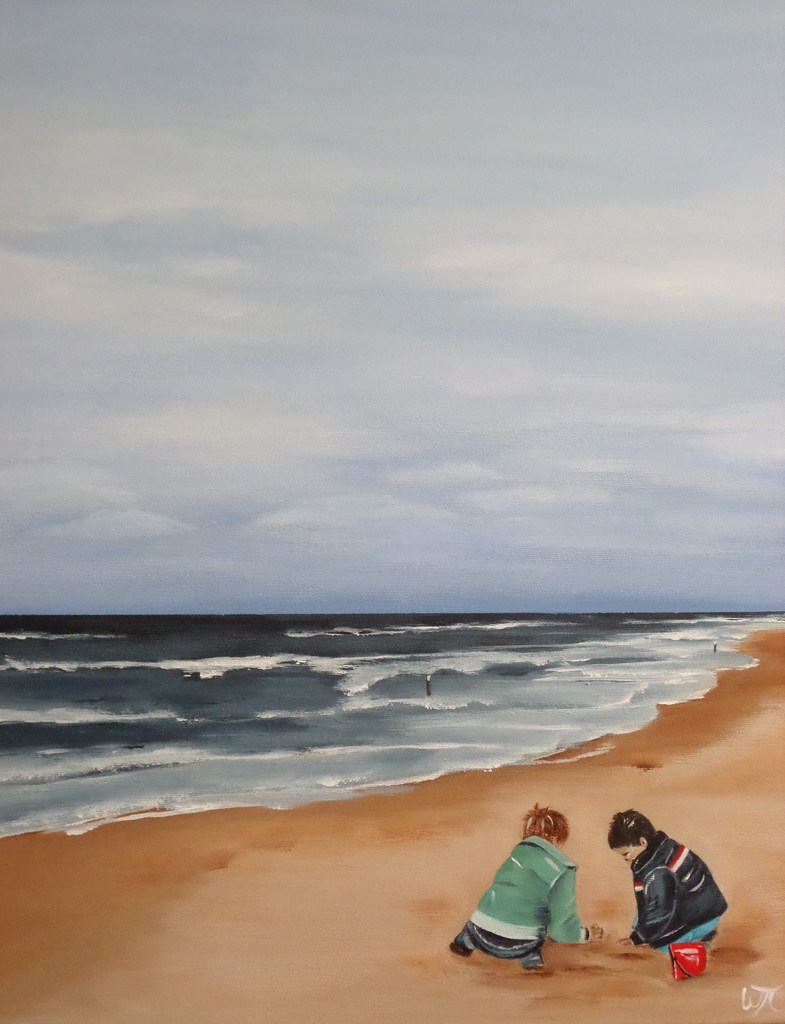 41 Strandtafereeltje van twee jongetjes spelend in het zand geschilderd aan de hand van een foto