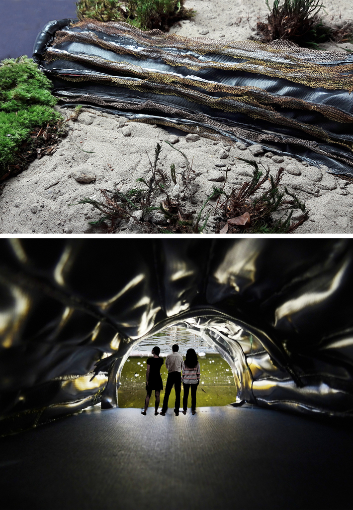 Men wil voor het Immerlo park in Arnhem Zuid een ontmoetingsplek. Dat kan zijn; een paviljoen, een andersoortig bouwwerkje of een buitenplek waar mensen kunnen zitten Het kan ook een beeld zijn dat juist niet vanuit een dergelijke gebruiksfunctie is bedacht, maar wel de plek markeert en juist hier iets toevoegt, specifiek voor deze plek. Het kan een heel persoonlijk gebaar zijn waarin je een stempel zet op de locatie. Het werk kan overal in het park bedacht worden, ook in het water van de plas. Mijn idee is een buisvormig paviljoen gemaakt van bewerkt rubber. Dit houdt regen, wind en lawaai tegen. Het paviljoen ligt gedeeltelijk onder de grond zodat je half onder water kunt kijken. Geen stoelen en tafels maar actief blijven staan, rondlopen, met elkaar praten en kijken naar wat er in het water te zien is. Zijn er vissen???? Hoe groot zijn die??? Zomers kun je er zwemmen, dus ook onder water. - Uitgevoerd in rubber zodat het regen, wind en geluid tegen kan houden. - Staat op de grens van land en water. - In een buisvorm zodat het mooier in het landschap past. Met bovenop korstmossen of vetplanten. - Aan de voorkant een raam dat uitzicht biedt aan zowel het onderwater als de oppervlakte van het water van de plas. Zoals in dierentuinen wel wordt toegepast. - Zonder banken of stoelen zodat er interactief gekeken kan worden wat er zich afspeelt in en onder het water. - Ingang via een deur aan de achterkant. - Hoogte 2.50 meter. Breedte 4.50 meter. Lengte 6.00 meter.