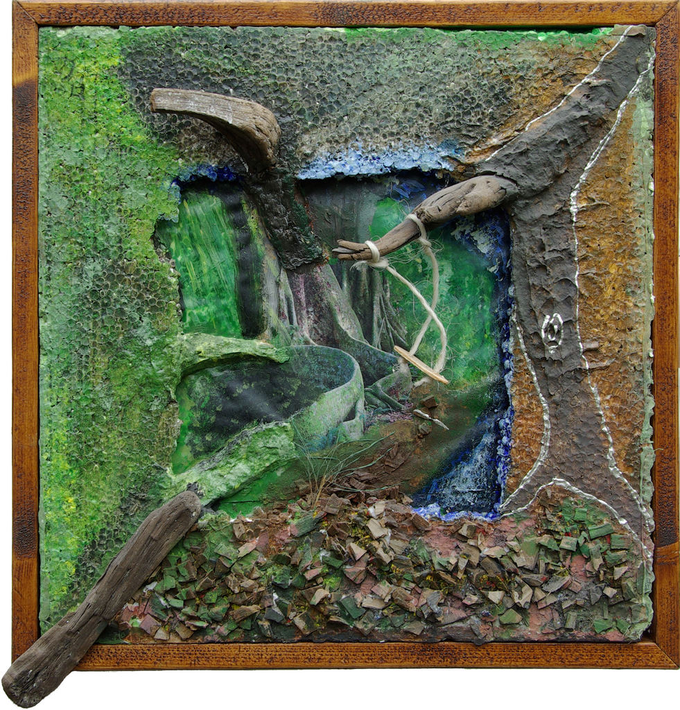 Boom is ontstaan door het plaatje van de bovenliggende wortels deze ligt midden in het schilderij. Daarna ben ik het schilderij gaan opvullen met verschillende materialen.Het schilderij is een fantasie boom.