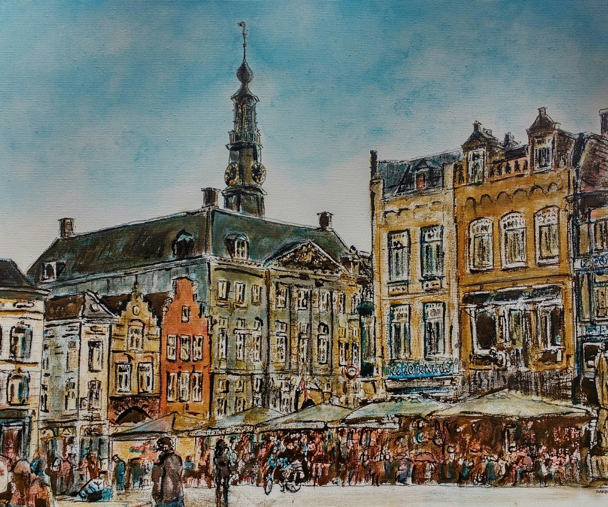 Stadhuis, de markt, cafe's "in de Kleine Werelt" en "Tijl Uilenspiegel" in 's-Hertogenbosch, getekend en geschilderd met rietpen en penseel in diverse kleuren inkt op linnen doek 50x60 cm.