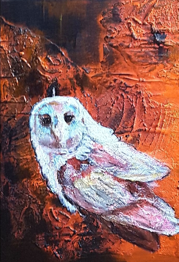 Uiltje in al haar wijsheid......geschilderd op plat doekje