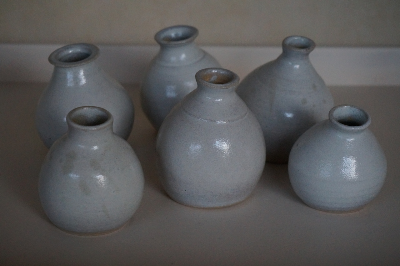 Gedraaide mini-vaasjes die iets scheef staan, witte klei, mat lichtgrijs glazuur.