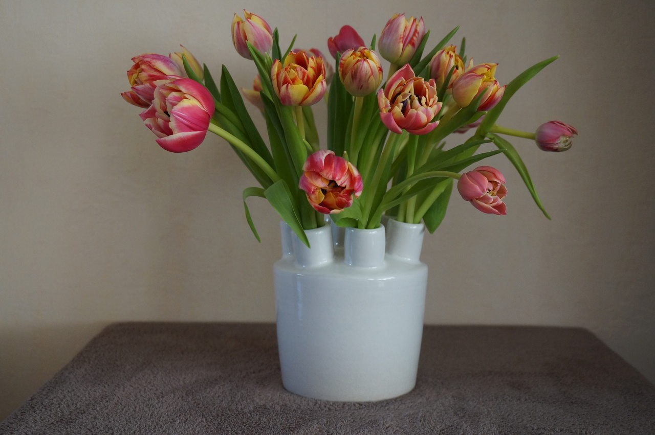 Strakke tulpenvaas. Gedraaid van witte klei, geglazuurd met wit glanzend glazuur.