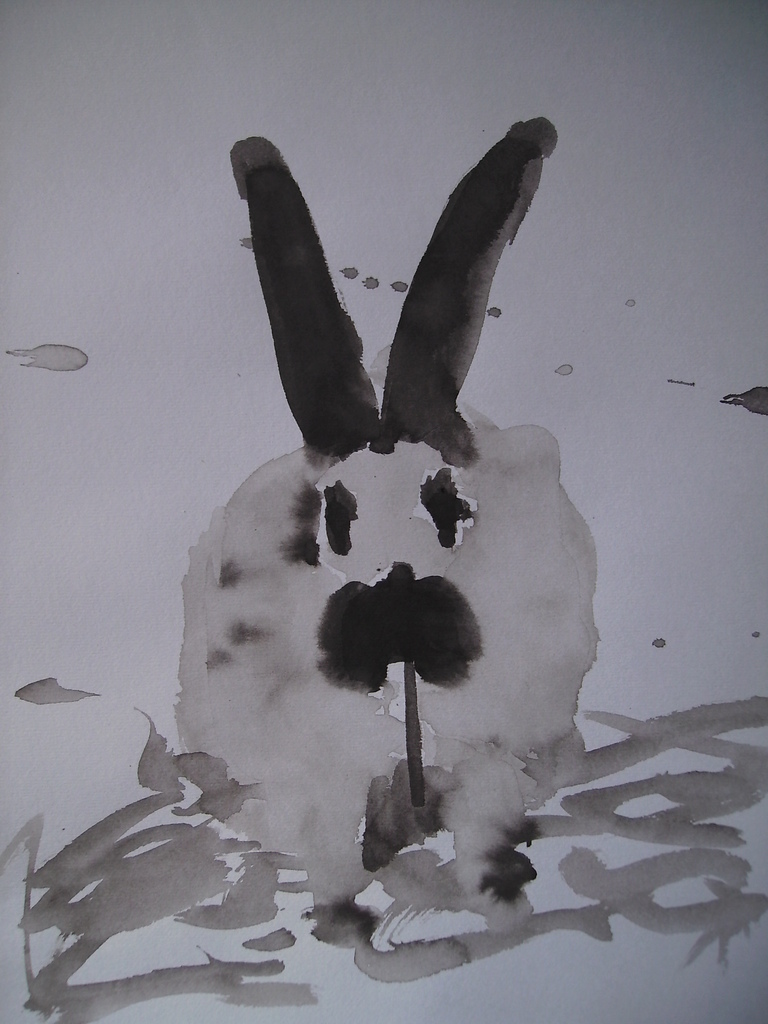 snelle schets van etend konijn naar de waarneming. Een van een serie schetsen van konijnen, kippen en varkens.