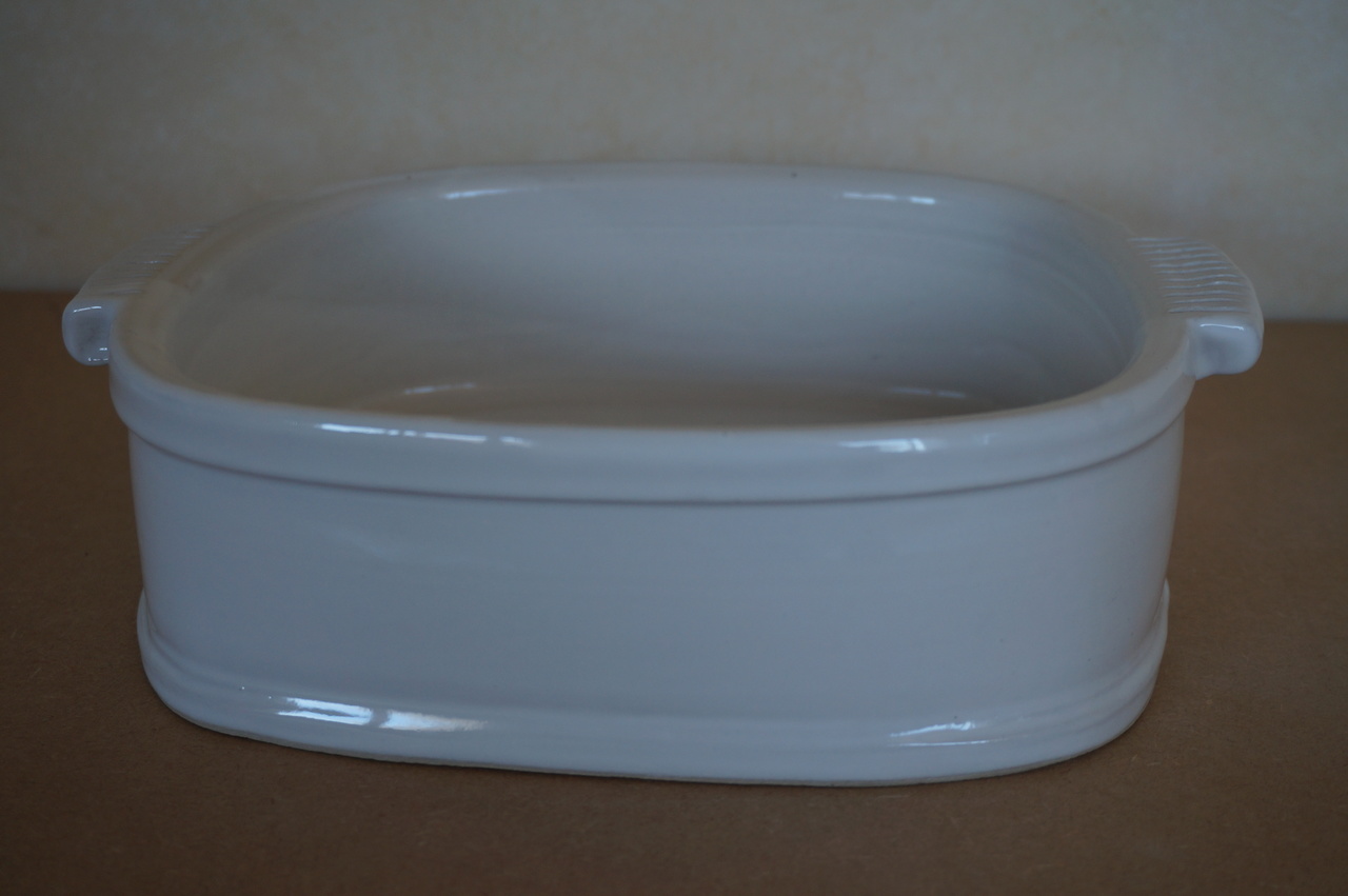 Ovenschaal, rand gedraaid op de draaischijf van witte klei. Daarna vervormd en voorzien van een bodem. Geglazuurd met wit glanzend glazuur.