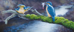 IJsvogel met jong. De ijsvogel voert het jong op een oude, met mos begroeide overhangende tak.