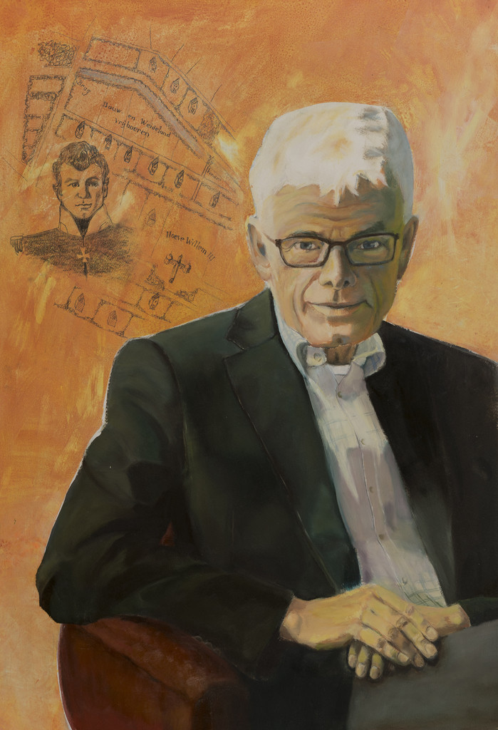 Portret van Jan Mensink, oud-directeur van de Maatschappij van Weldadigheid met op de achtergrond Johannes van den Bosch die 200 jaar geleden de Maatschappij van Weldadigheid oprichtte. Geschonken aan de Maatschappij van Weldadigheid in Frederiksoord