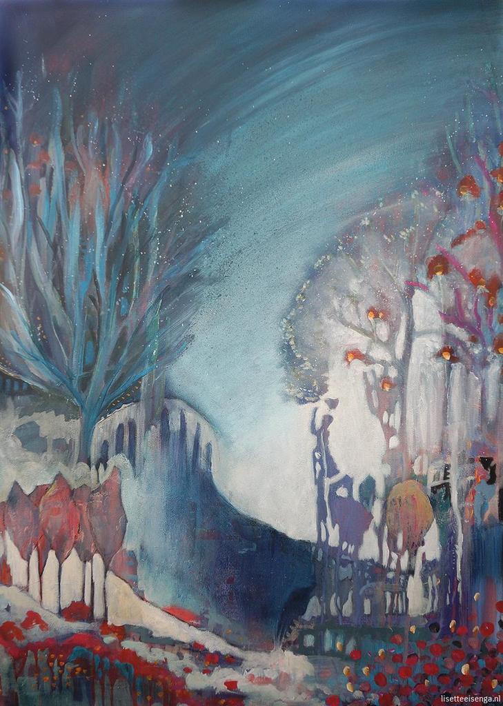 In het licht van de opgaande zon trekt een optocht van vreemde figuren door een sprookjesachtig landschap. Inclusief staaldraad ophangsysteem, exclusief baklijst. Ik hanteer bij dit kunstwerk geen vaste prijs. Je mag zelf aangeven wat je voor dit werk zou willen geven (vanaf €250,00)