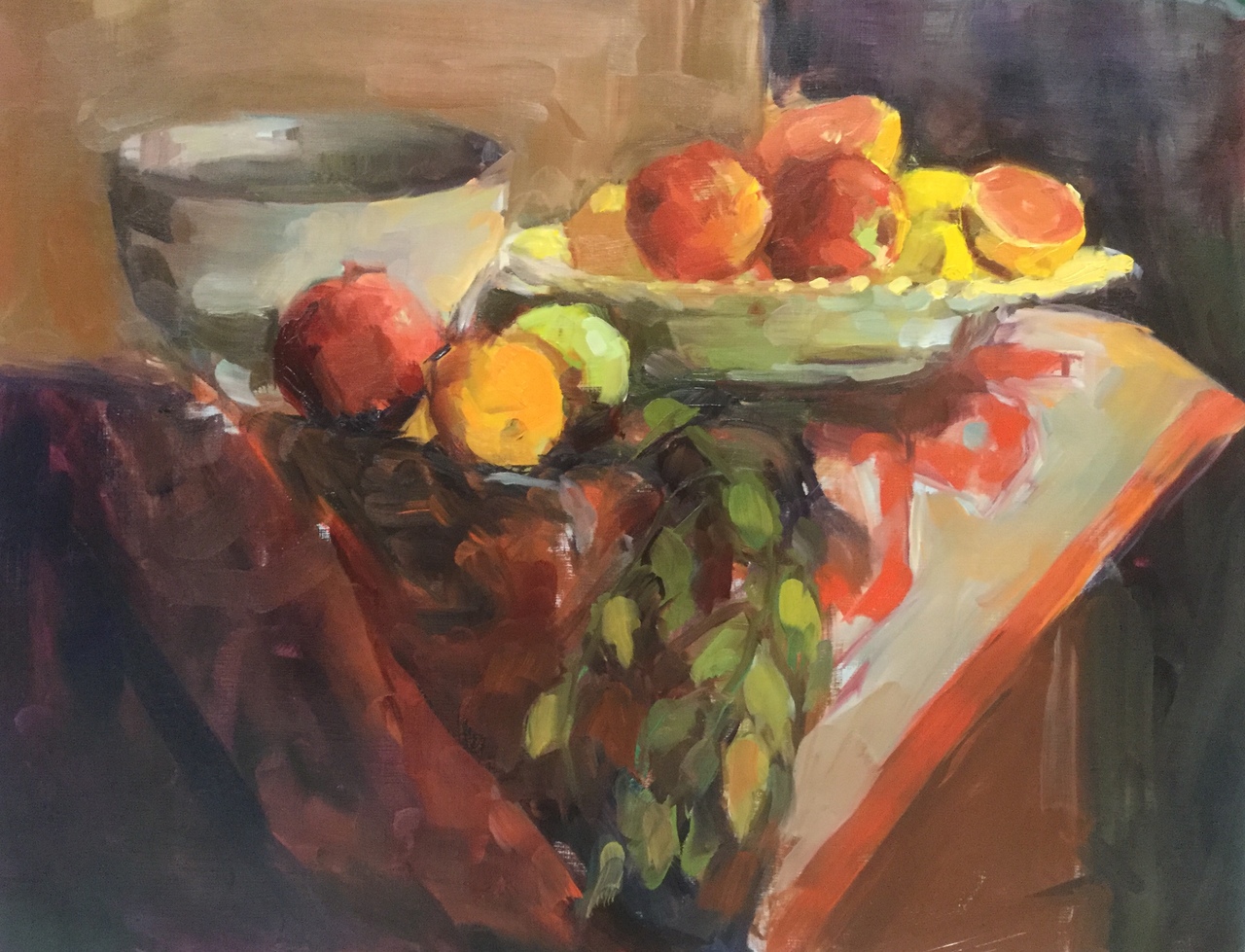 A la prima geschilderd stilleven met grapefruit, appels, citroenen