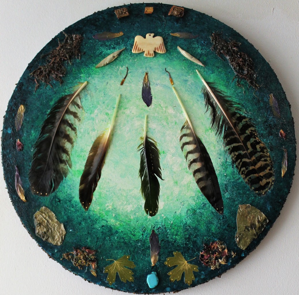 In dit intuïtieve schilderij is de energie van de Ayahuasca cerfemonie vastgelegd. Met de Spirit van de vogels (Buizerd, Valk, Papegaai, Havik en Uil) krijgen we het Grotere geheel te zien. De componenten voor de Ayahuasca (gedroogde bladeren, hout, zaadjes) zijn in dit werk verwerkt, evenals de Mimosa en andere kruiden en de turquoois kristal.