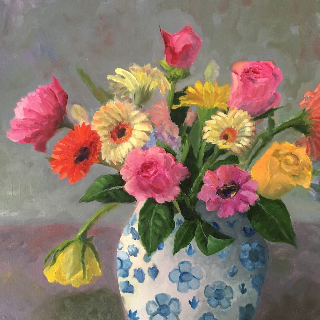 Rozen en gerbera's in vaas delfts blauw.
