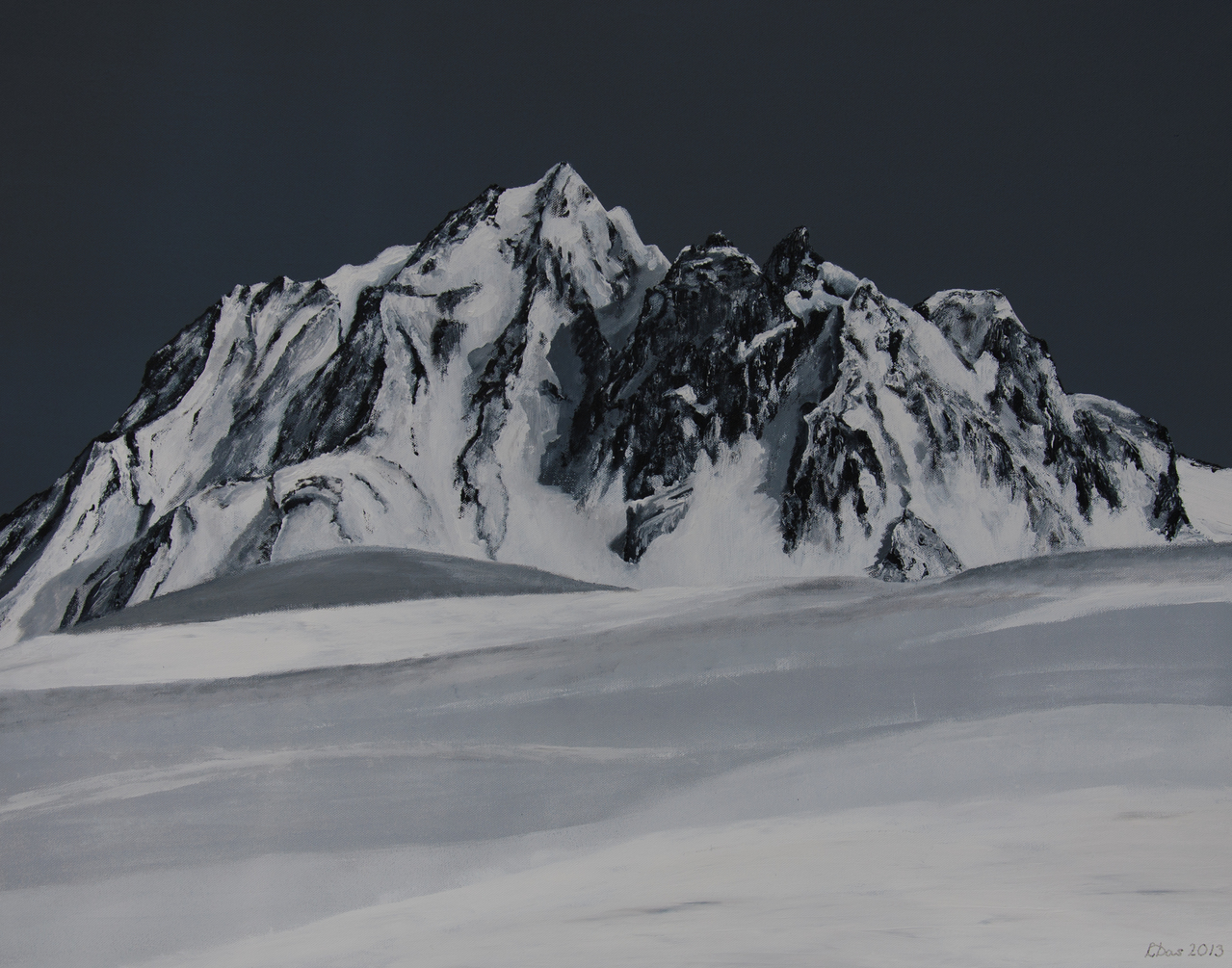Bergen. Winter. Acryl. Alleen zwarte en witte verf gebruikt in combinatie met gladde en structuur pasta. Doek op houten raam gespannen. Zijkanten (4 cm) doorgeschilderd. Niet ingelijst