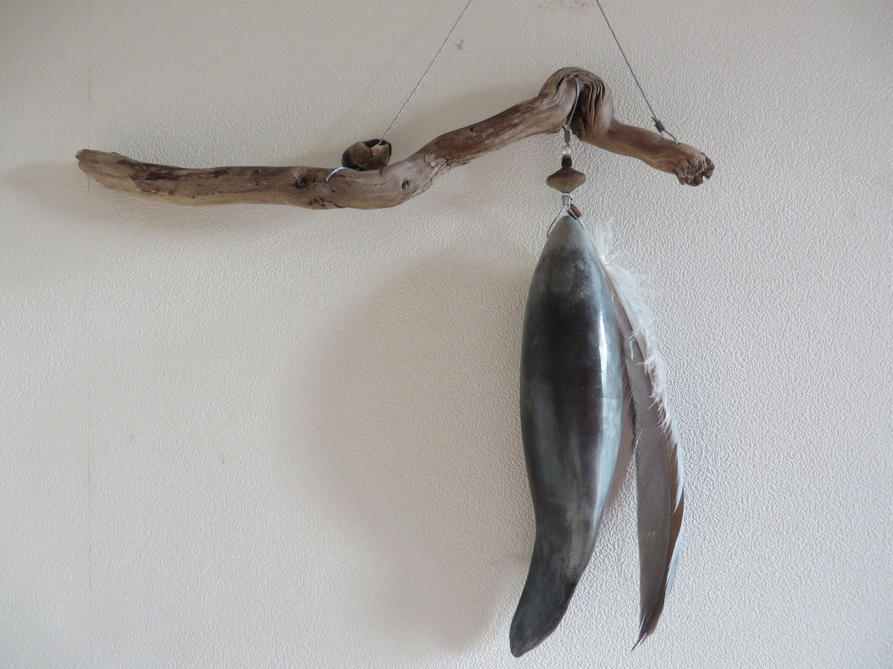 Pitfire vis, gecombineerd met hout, schelpen en veer.
