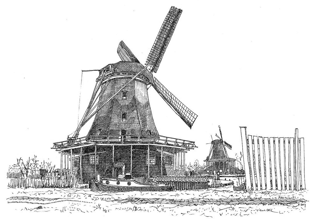 Pentekening Dezoeker Molen Zaanseschans Zwart Wit Inkt Kalender Tekening
