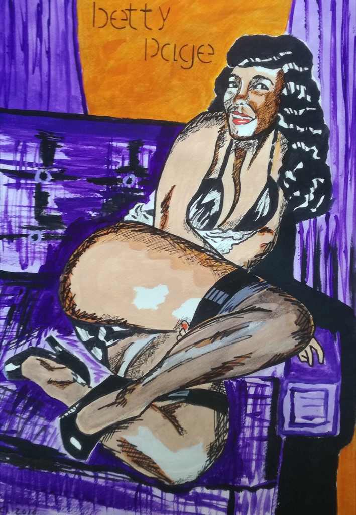 Ingekleurde schets/studie op aquarel papier in acryl en stift. Bettie Page een van de eerste pin-ups in de jaren '50 en misschien ook wel de bekendste.