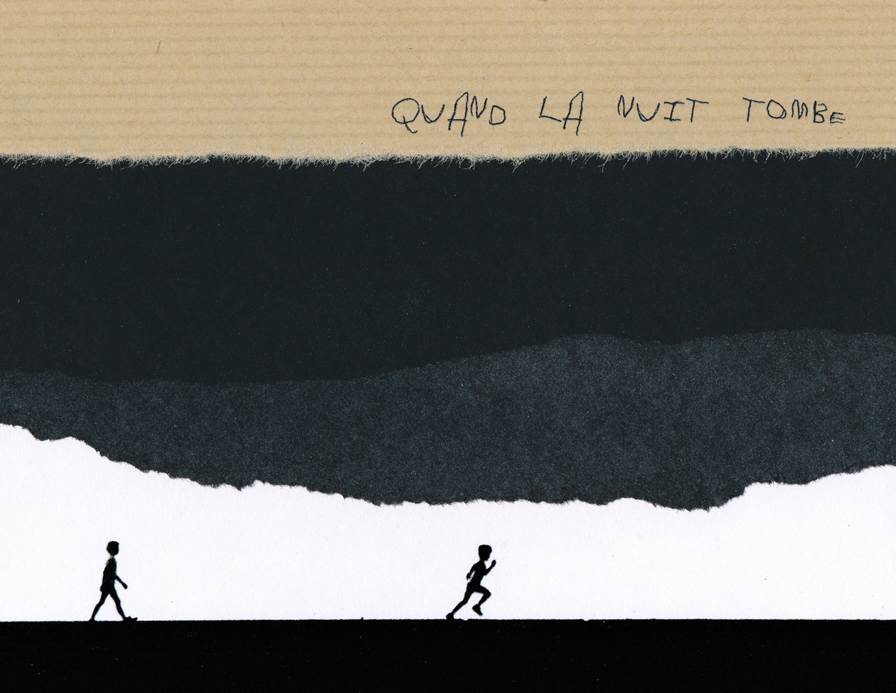 Quand la nuit tombe: Naar huis rennen als de duisternis van de nacht aanbreekt.- papieren collage en tekst