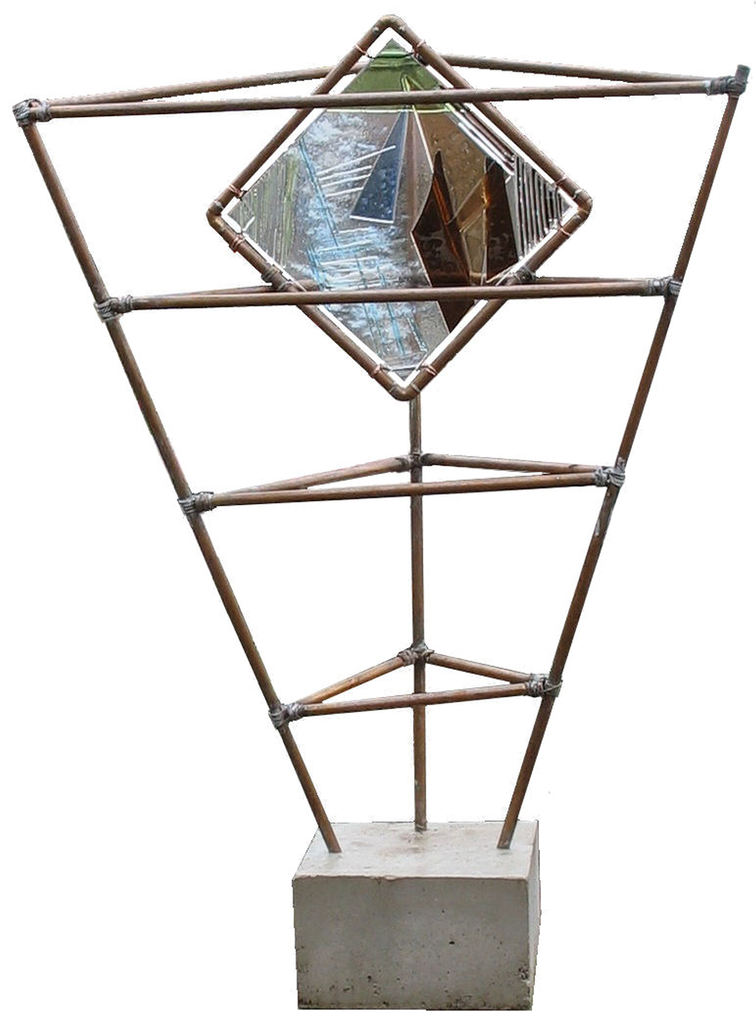 Waterval is gemaakt doormiddel van glasfusen. Het is een waterval die ik in Mexico had gezien tijdens de vakantie. De foto ervan heb ik abstract gemaakt en daarvanuit ben ik het ontwerp gaan maken. Het koperen frame is geinspeireerd door de vlakverdeling in onze voortuin waar we het beeld plaatsten. De voet is van gegeoten beton.