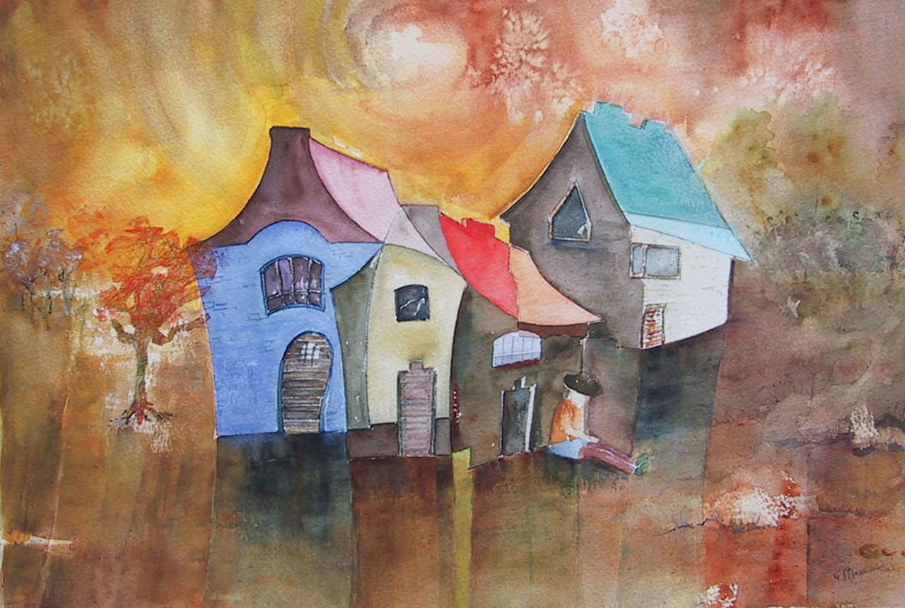 Drie huizen ineen. Lijnen van het ene huis zijn gelijktijdig ook lijnen van het andere huis. Verzengende zon. man of vrouw doet hier een dutje, ter bescherming hoed op.
