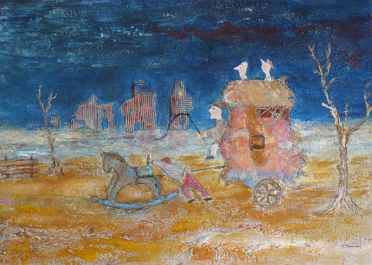 Op stevig papier gemaakt met gesso, jute, acryl,gescheurd karton