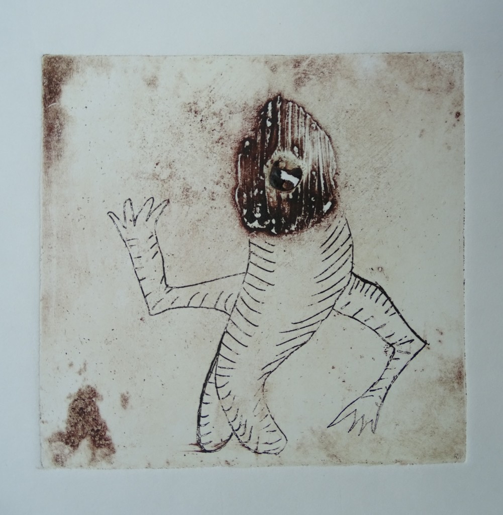 "Op twee voeten staand / met armen geplaatst / aan de goede kant / en de verkeerde, / is er de illusie / voor één minuut / van innerlijk evenwicht." (ets, afmeting van afbeelding 11x11 cm)