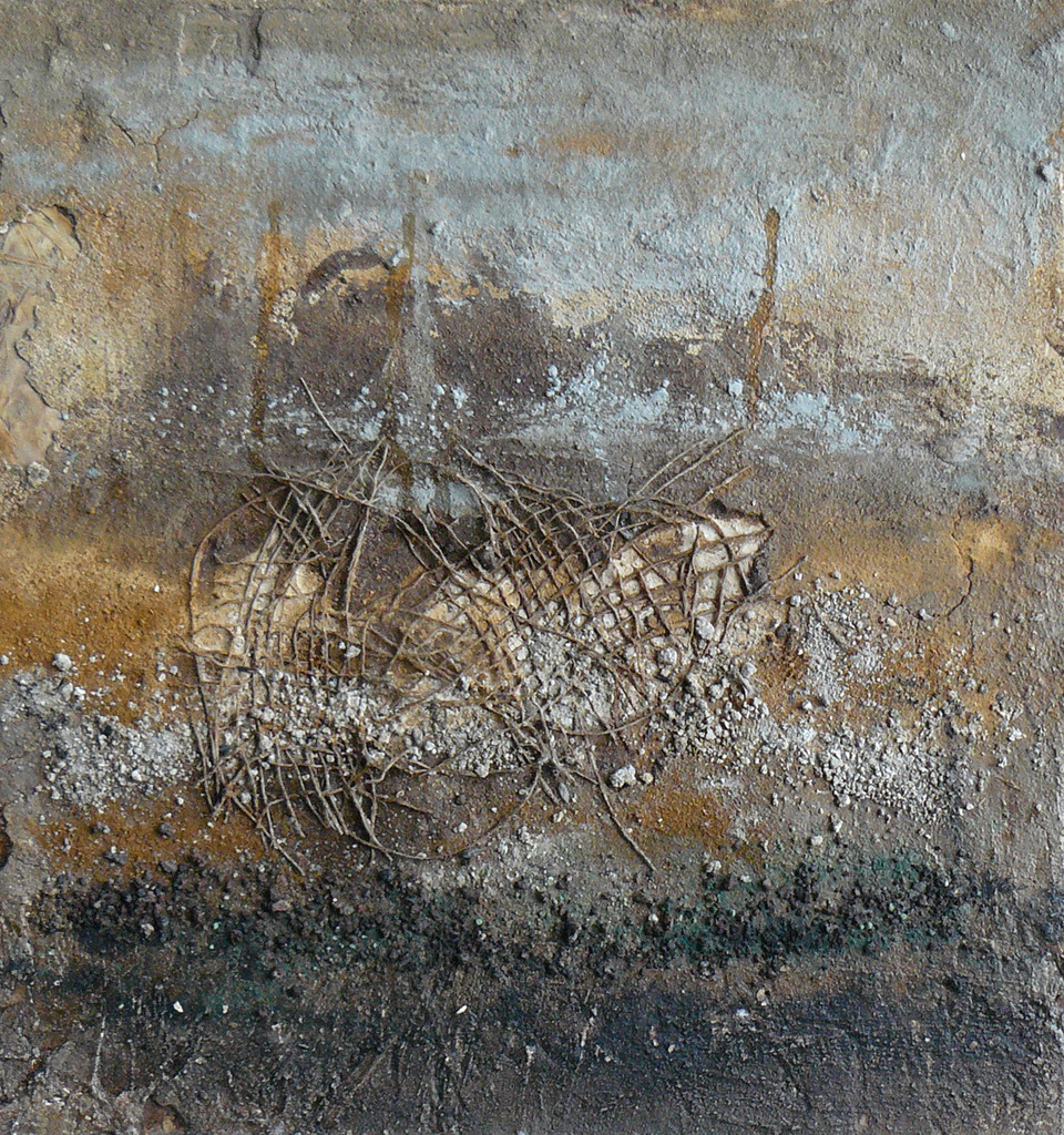 Op houten plaat met natuurlijm, klei, leem, jute pigmenten, as, steentjes