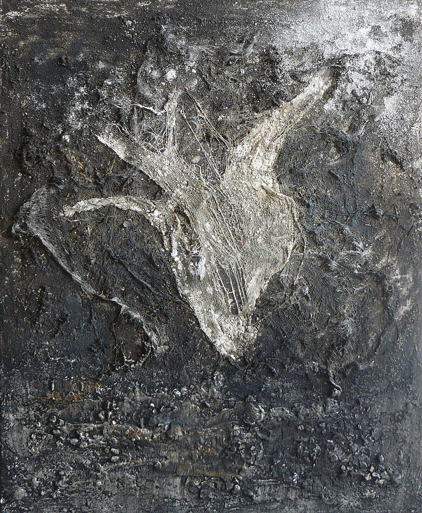 Plaat hout bewerkt met brander, met natuurlijm, jute, gaas, verband, as