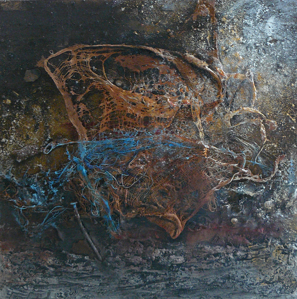 Plaat hout met natuurlijm leem roest zand gaas pigment kalkresten.
