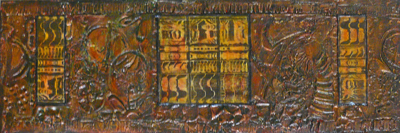 Toen zonlicht op centrale verwarming scheen ontstonden er op de vloer de verrassende lijnen en vormen, die hier te zien zijn. Met structuurpasta en acryl en acrylinkt.