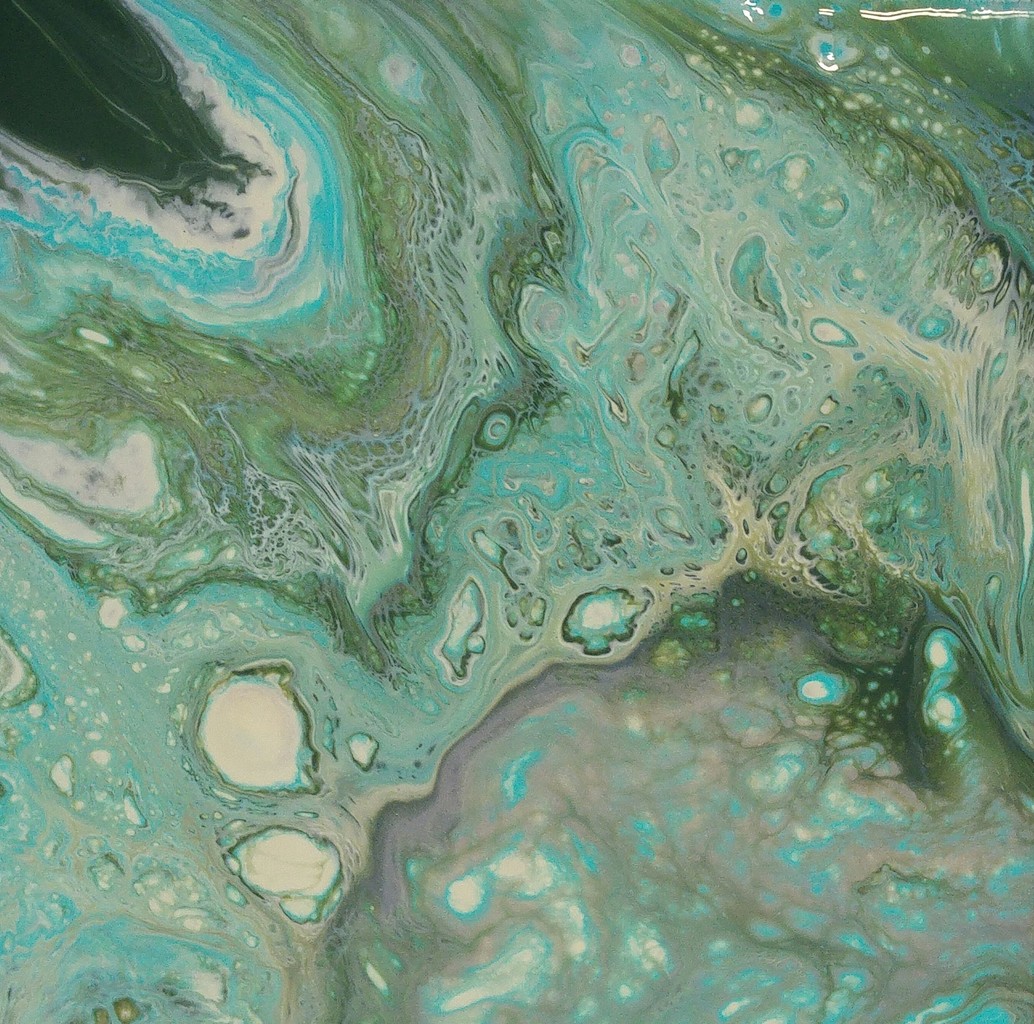 Acrylic Pouring met Engels geel, turquoise, olijfgroen en tin met als dominantie kleuren olijfgroen en turquoise.