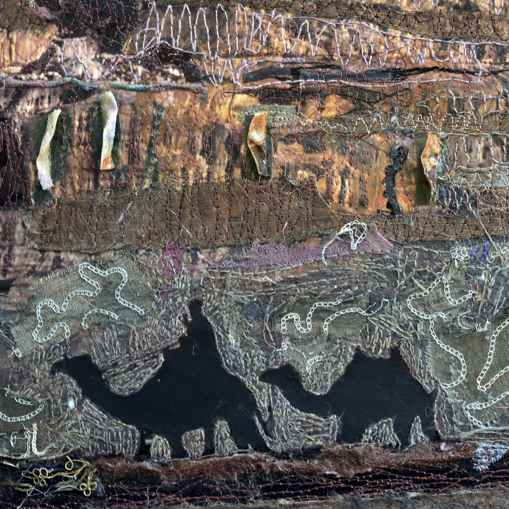 Ik ben een materialen mens, en maak samenvoegingen van verschillende materialen; foto’s, stoffen en borduursels, soms ook gecombineerd met hout, lood en steen, op wisselende formaten